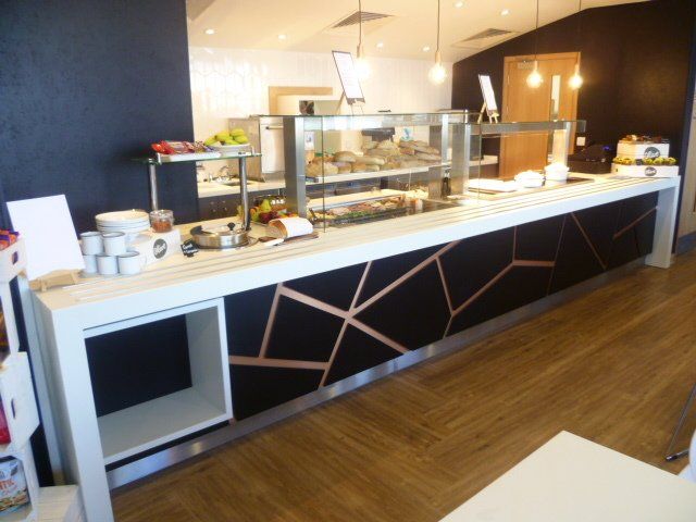 Working for with one of the country’s leading independent contract caterers Stangard were asked to design, supply and install a new servery system to replace the old stainless-steel units to create a new look and feel, improve food presentation and speed up service. The final solution uses hard wearing contemporary materials both on the counters & floor and creates a mirrored layout that is more open and flexible.