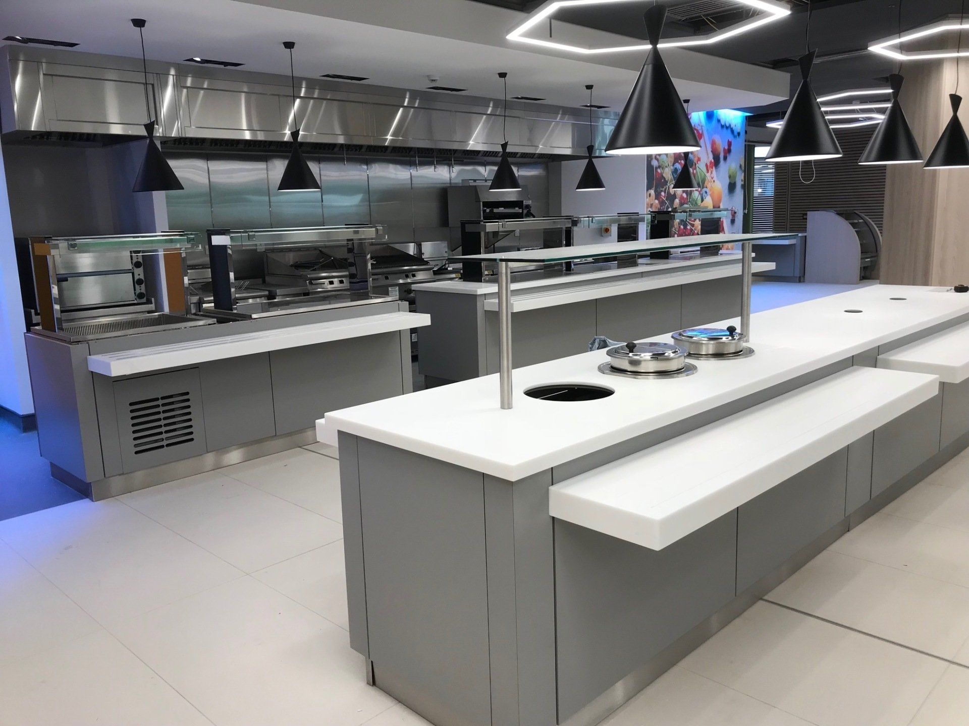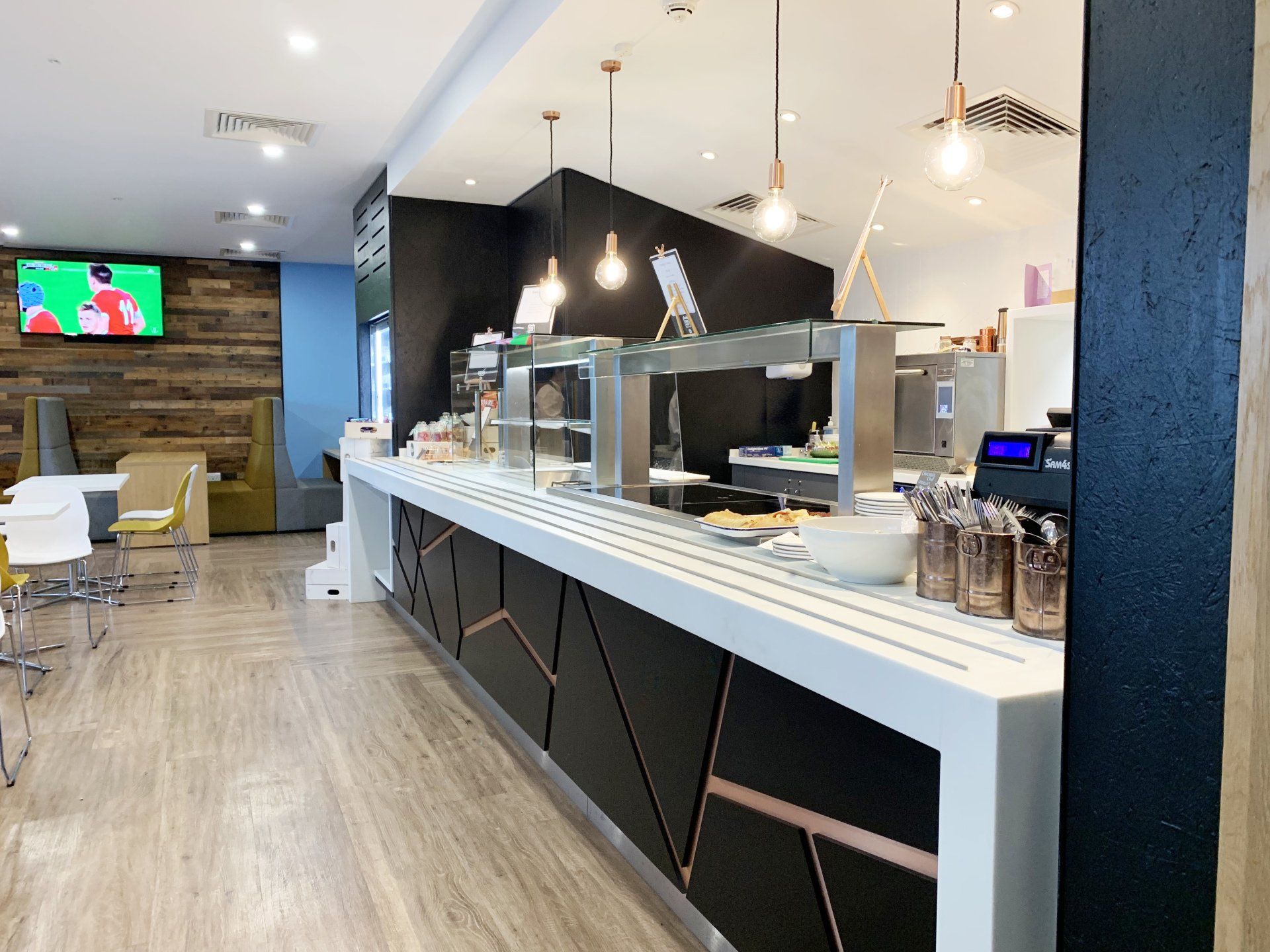 Working for with one of the country’s leading independent contract caterers Stangard were asked to design, supply and install a new servery system to replace the old stainless-steel units to create a new look and feel, improve food presentation and speed up service. The final solution uses hard wearing contemporary materials both on the counters & floor and creates a mirrored layout that is more open and flexible.